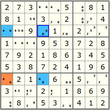 Y Wing, sometimes called XY wing because of its similarity to the X wing technique. The Y wing requires 1 cell the "pivot" to have only 2 avaliable digits. then we must find 2 "pincer" cells, these cells must have only 2 digits avaliable, must share the same number with the pivot, and a seperate number with the other pincer. This relationship will for a unique triple locking the digit that is shared between the two pencirs out of the cell where they intersect(usually this is a single cell).
